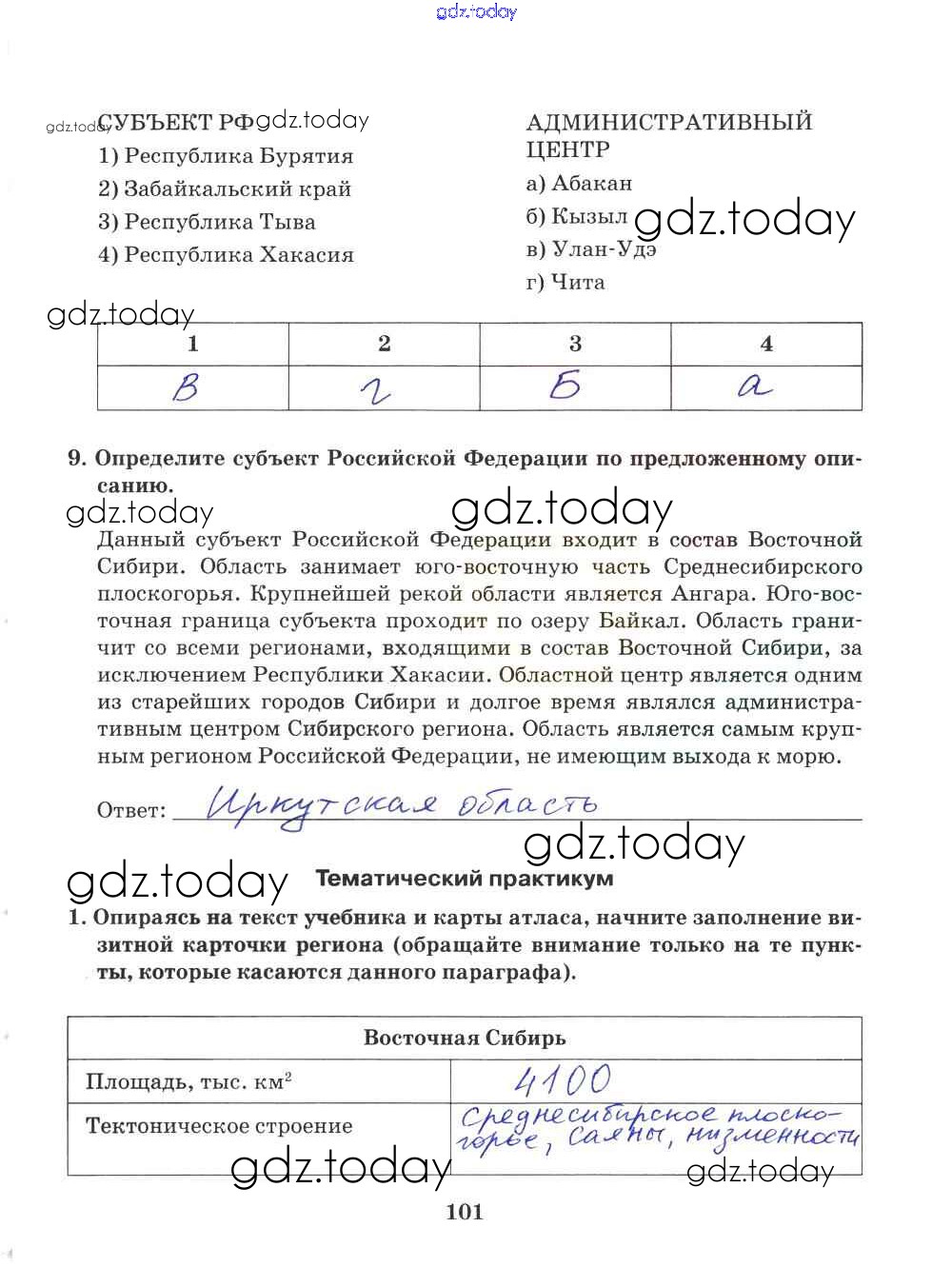 На страницах сайта gdz.today вы найдете учебный и вспомогательный материал, направленный на улучшения знаний школьной программы. ГДЗ - онлайн мир знаний Решение к части 1. Страницы 101 Рабочей тетради по Географии для 9 класса Домогацких Русское слово Инновационная школа 2018