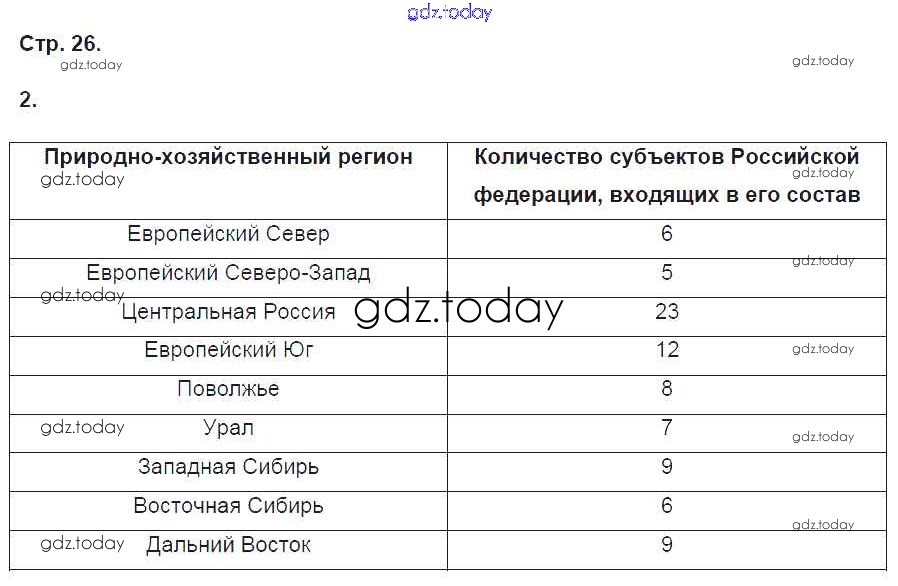 На страницах сайта gdz.today вы найдете учебный и вспомогательный материал, направленный на улучшения знаний школьной программы. ГДЗ - онлайн мир знаний Решение к части 1. Страницы 26 Рабочей тетради по Географии для 9 класса Домогацких Русское слово Инновационная школа 2018