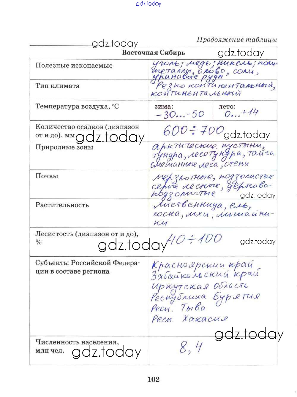 На страницах сайта gdz.today вы найдете учебный и вспомогательный материал, направленный на улучшения знаний школьной программы. ГДЗ - онлайн мир знаний Решение к части 2. Страницы 102 Рабочей тетради по Географии для 9 класса Домогацких Русское слово Инновационная школа 2018