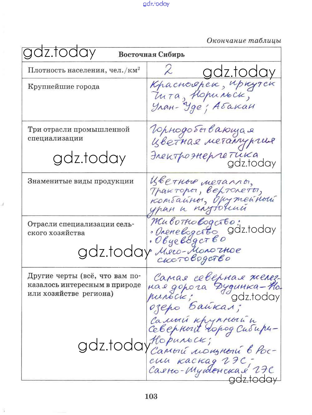 На страницах сайта gdz.today вы найдете учебный и вспомогательный материал, направленный на улучшения знаний школьной программы. ГДЗ - онлайн мир знаний Решение к части 2. Страницы 103 Рабочей тетради по Географии для 9 класса Домогацких Русское слово Инновационная школа 2018