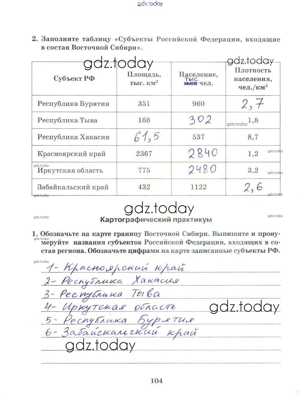 На страницах сайта gdz.today вы найдете учебный и вспомогательный материал, направленный на улучшения знаний школьной программы. ГДЗ - онлайн мир знаний Решение к части 2. Страницы 104 Рабочей тетради по Географии для 9 класса Домогацких Русское слово Инновационная школа 2018
