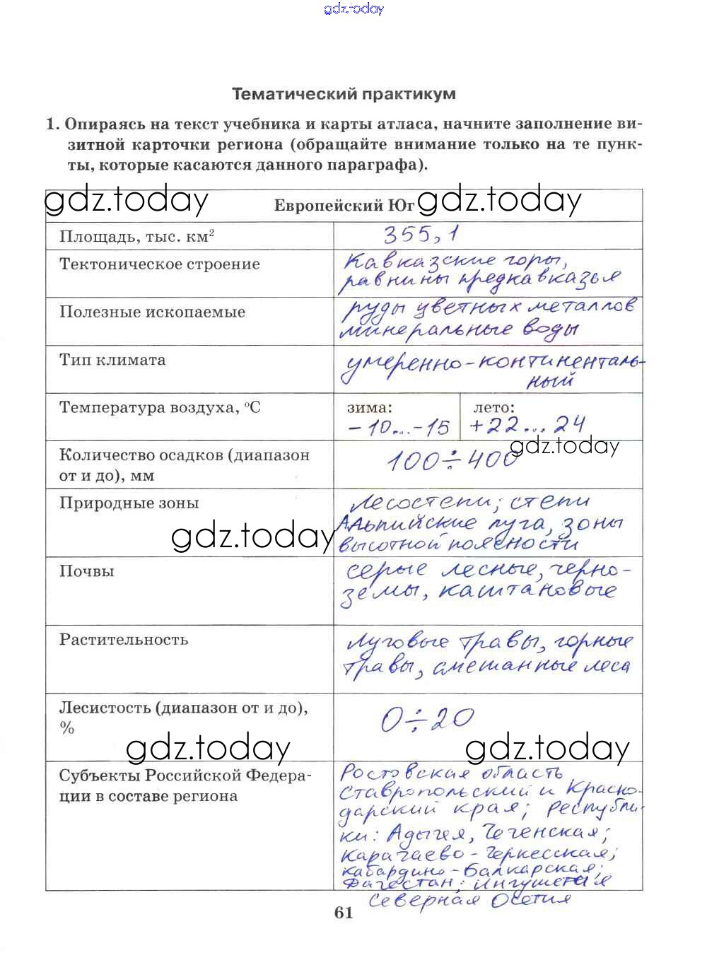 На страницах сайта gdz.today вы найдете учебный и вспомогательный материал, направленный на улучшения знаний школьной программы. ГДЗ - онлайн мир знаний Решение к части 2. Страницы 61 Рабочей тетради по Географии для 9 класса Домогацких Русское слово Инновационная школа 2018