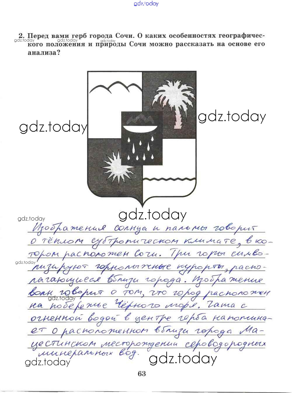 На страницах сайта gdz.today вы найдете учебный и вспомогательный материал, направленный на улучшения знаний школьной программы. ГДЗ - онлайн мир знаний Решение к части 2. Страницы 63 Рабочей тетради по Географии для 9 класса Домогацких Русское слово Инновационная школа 2018