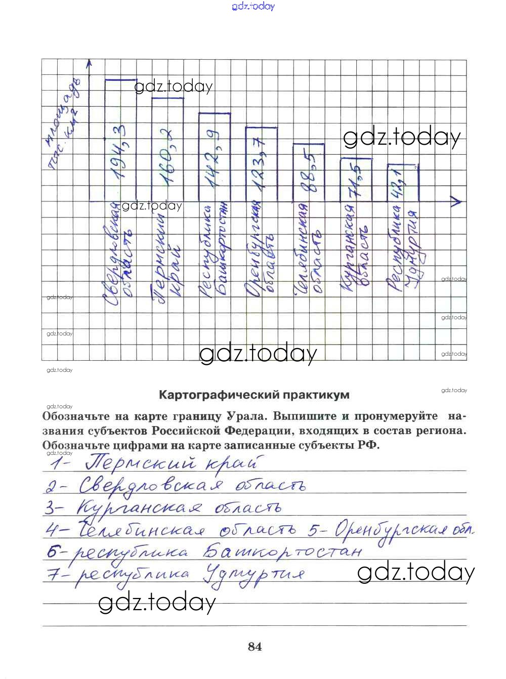 На страницах сайта gdz.today вы найдете учебный и вспомогательный материал, направленный на улучшения знаний школьной программы. ГДЗ - онлайн мир знаний Решение к части 2. Страницы 84 Рабочей тетради по Географии для 9 класса Домогацких Русское слово Инновационная школа 2018