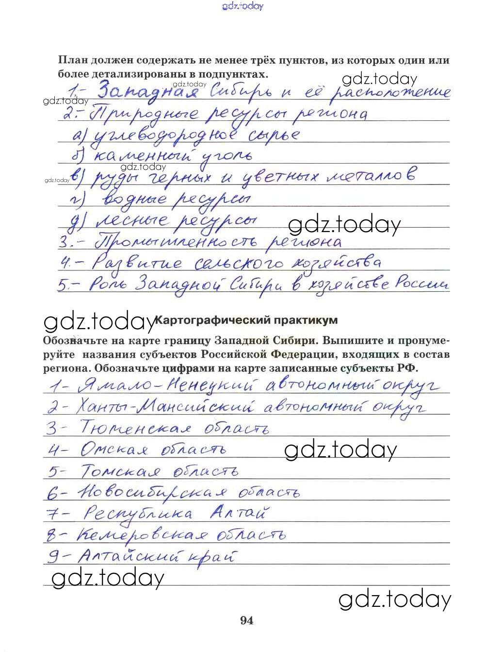 На страницах сайта gdz.today вы найдете учебный и вспомогательный материал, направленный на улучшения знаний школьной программы. ГДЗ - онлайн мир знаний Решение к части 2. Страницы 94 Рабочей тетради по Географии для 9 класса Домогацких Русское слово Инновационная школа 2018