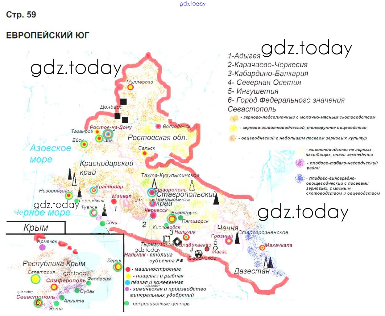 На страницах сайта gdz.today вы найдете учебный и вспомогательный материал, направленный на улучшения знаний школьной программы. ГДЗ - онлайн мир знаний Страницы (решение) 59 Рабочей тетради с контурными картами по Географии для 9 класса Сиротин Дрофа 2020