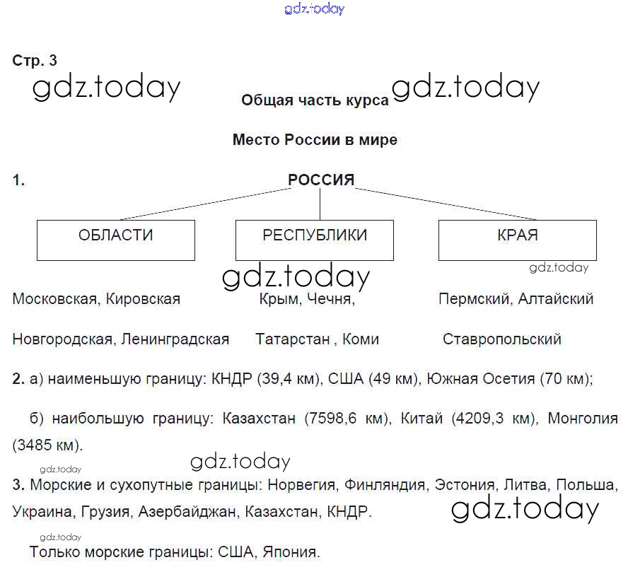 На страницах сайта gdz.today вы найдете учебный и вспомогательный материал, направленный на улучшения знаний школьной программы. ГДЗ - онлайн мир знаний Страницы (решение) 3 Рабочей тетради по Географии для 9 класса Дронов Дрофа Вертикаль 2020