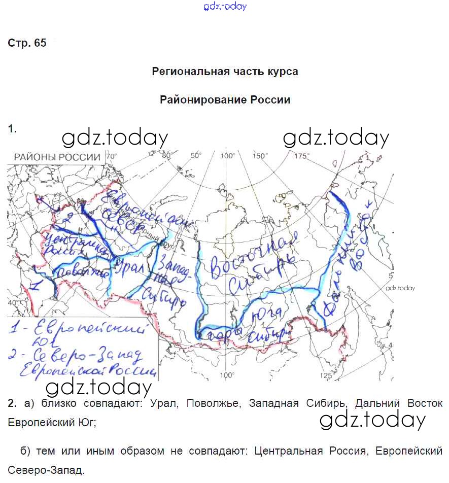 На страницах сайта gdz.today вы найдете учебный и вспомогательный материал, направленный на улучшения знаний школьной программы. ГДЗ - онлайн мир знаний Страницы (решение) 65 Рабочей тетради по Географии для 9 класса Дронов Дрофа Вертикаль 2020