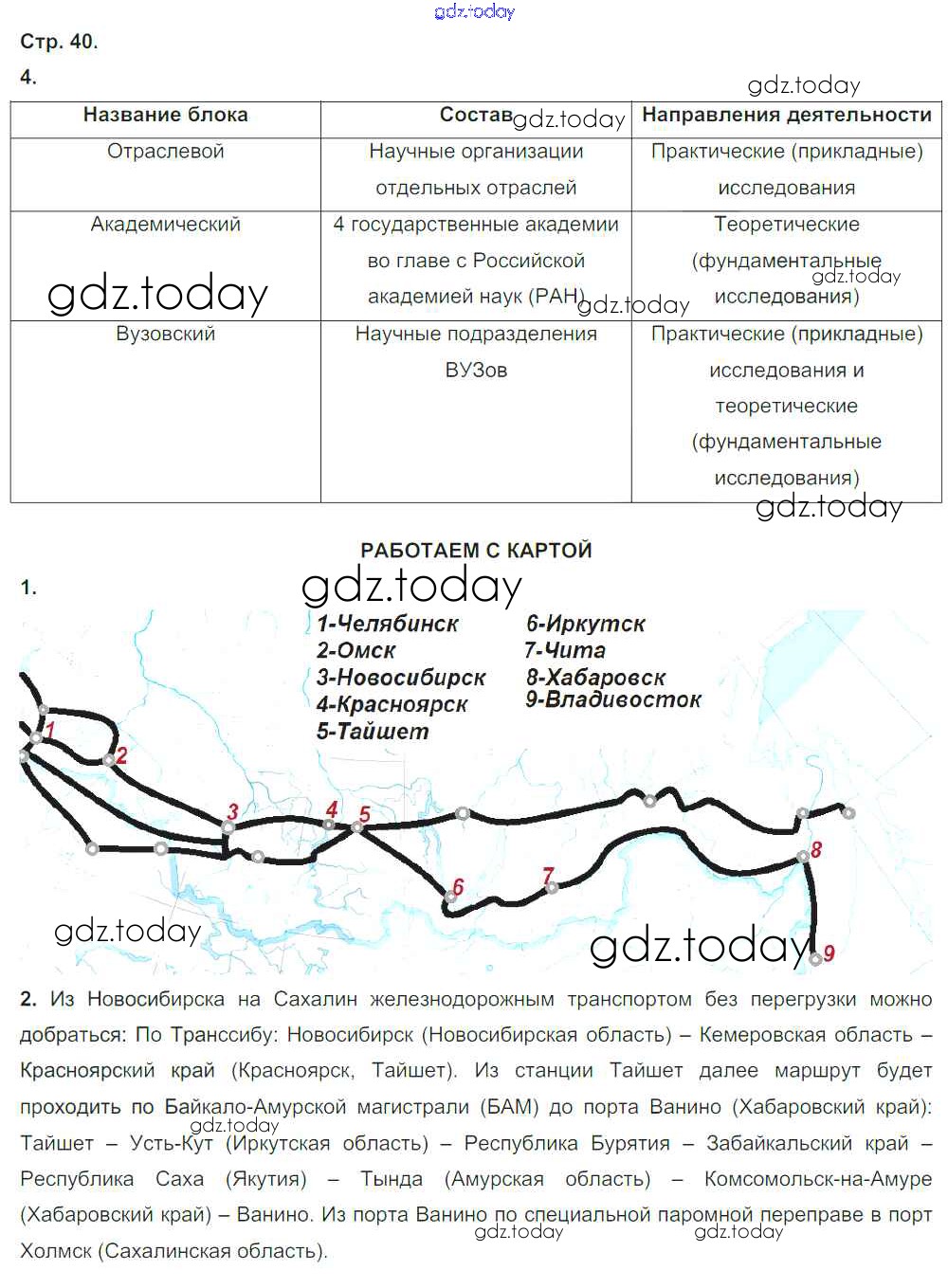 На страницах сайта gdz.today вы найдете учебный и вспомогательный материал, направленный на улучшения знаний школьной программы. ГДЗ - онлайн мир знаний Решение к главе 1. Хозяйство России стр.40 Тетради-тренажеру по Географии для 9 класса Ходова, Ольховая Просвещение Сферы 2016