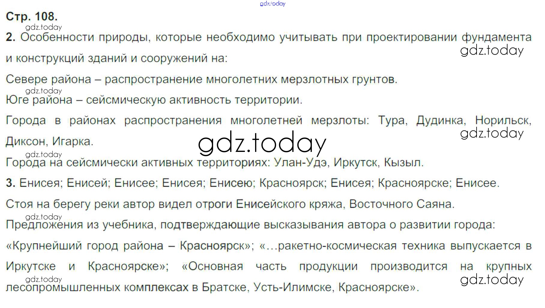 На страницах сайта gdz.today вы найдете учебный и вспомогательный материал, направленный на улучшения знаний школьной программы. ГДЗ - онлайн мир знаний Решение к главе 2. Районы России стр.108 Тетради-тренажеру по Географии для 9 класса Ходова, Ольховая Просвещение Сферы 2016