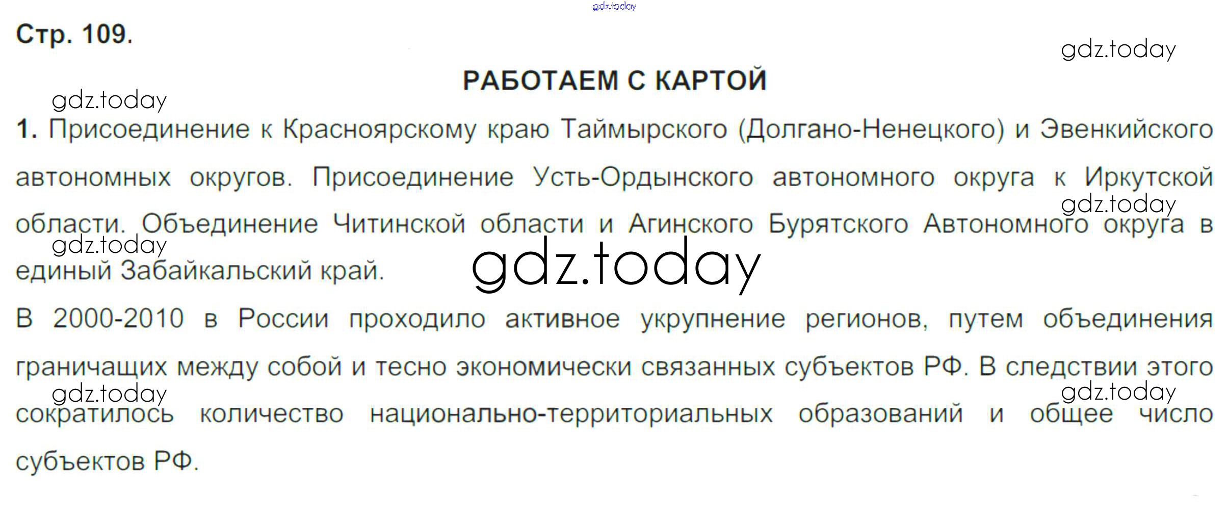 На страницах сайта gdz.today вы найдете учебный и вспомогательный материал, направленный на улучшения знаний школьной программы. ГДЗ - онлайн мир знаний Решение к главе 2. Районы России стр.109 Тетради-тренажеру по Географии для 9 класса Ходова, Ольховая Просвещение Сферы 2016
