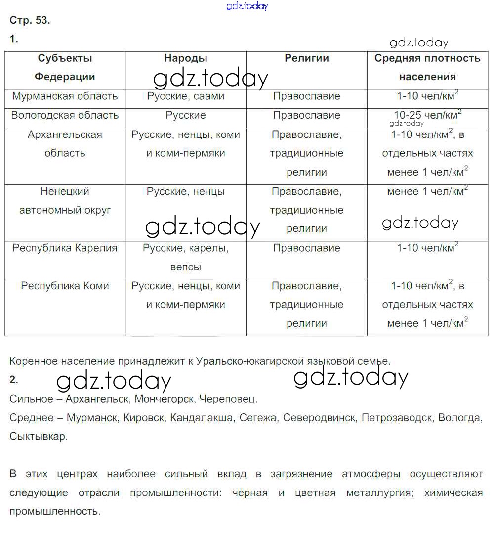 На страницах сайта gdz.today вы найдете учебный и вспомогательный материал, направленный на улучшения знаний школьной программы. ГДЗ - онлайн мир знаний Решение к главе 2. Районы России стр.53 Тетради-тренажеру по Географии для 9 класса Ходова, Ольховая Просвещение Сферы 2016