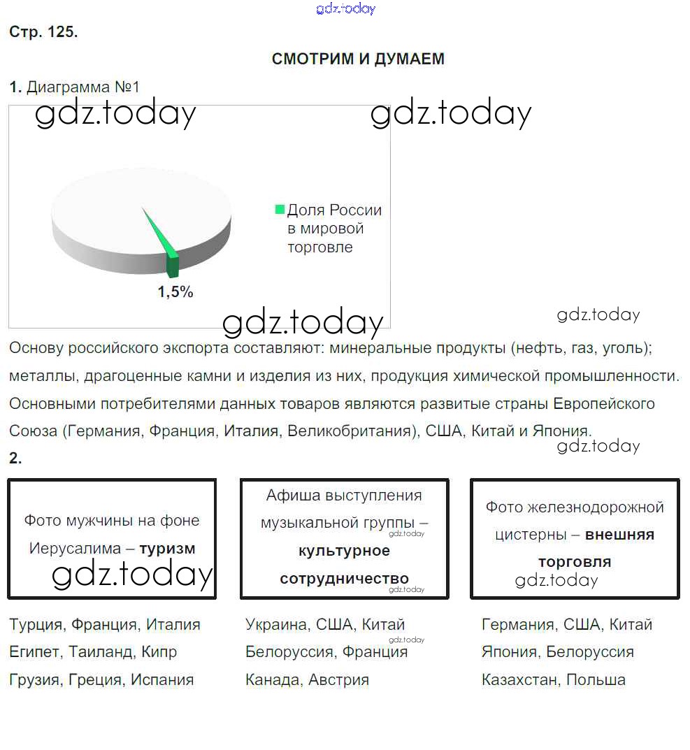 На страницах сайта gdz.today вы найдете учебный и вспомогательный материал, направленный на улучшения знаний школьной программы. ГДЗ - онлайн мир знаний Решение к главе 3. Россия в мире стр.125 Тетради-тренажеру по Географии для 9 класса Ходова, Ольховая Просвещение Сферы 2016