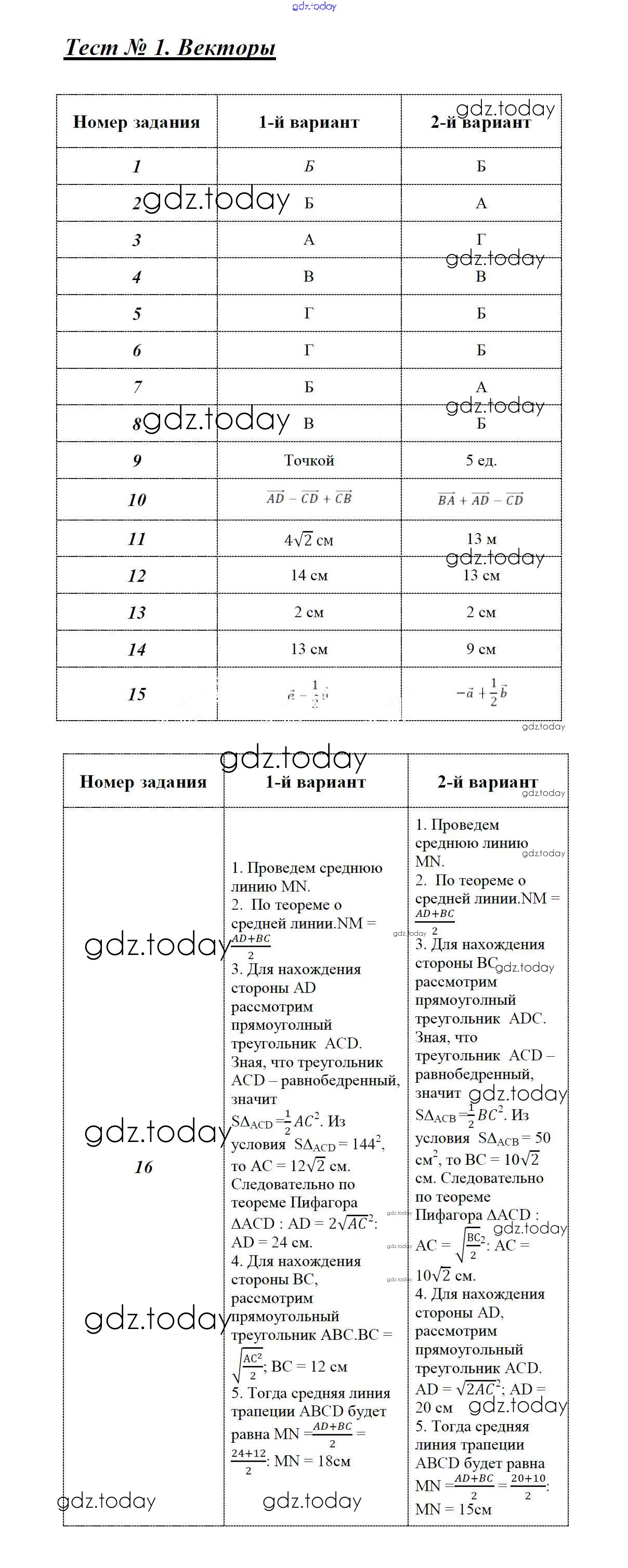 Ответы к Решение к тестам 1 Вариант 1 и 2 Тестам по Геометрии для 9 класса Фарков Экзамен УМК 2016