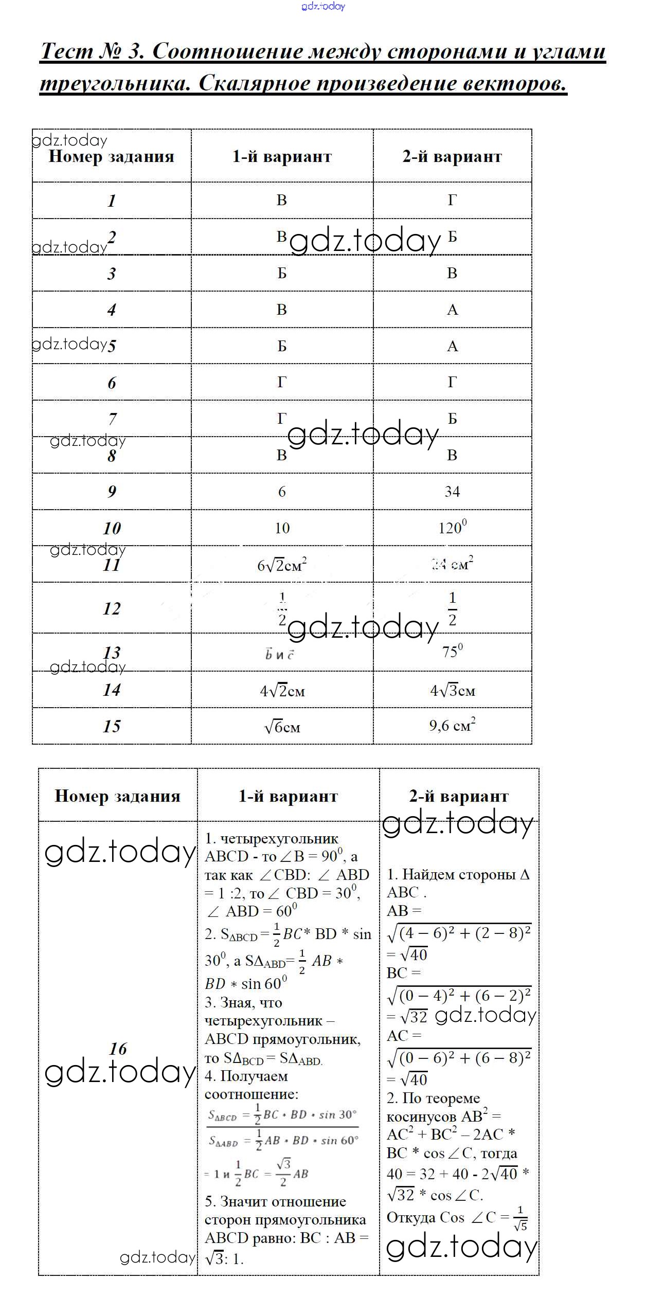На страницах сайта gdz.today вы найдете учебный и вспомогательный материал, направленный на улучшения знаний школьной программы. ГДЗ - онлайн мир знаний Решение к тестам 3 Вариант 1 и 2 Тестам по Геометрии для 9 класса Фарков Экзамен УМК 2016