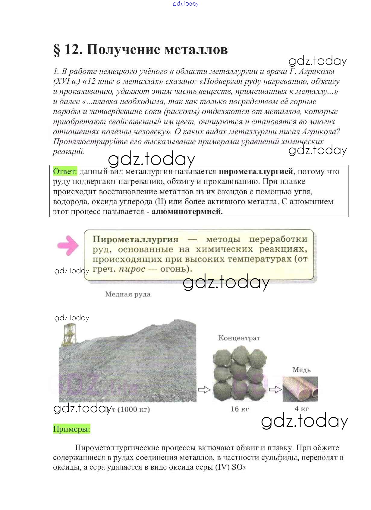 На страницах сайта gdz.today вы найдете учебный и вспомогательный материал, направленный на улучшения знаний школьной программы. ГДЗ - онлайн мир знаний Решение к §12. Получение металлов 1 Учебнику по Химии для 9 класса Габриелян Дрофа Вертикаль 2014