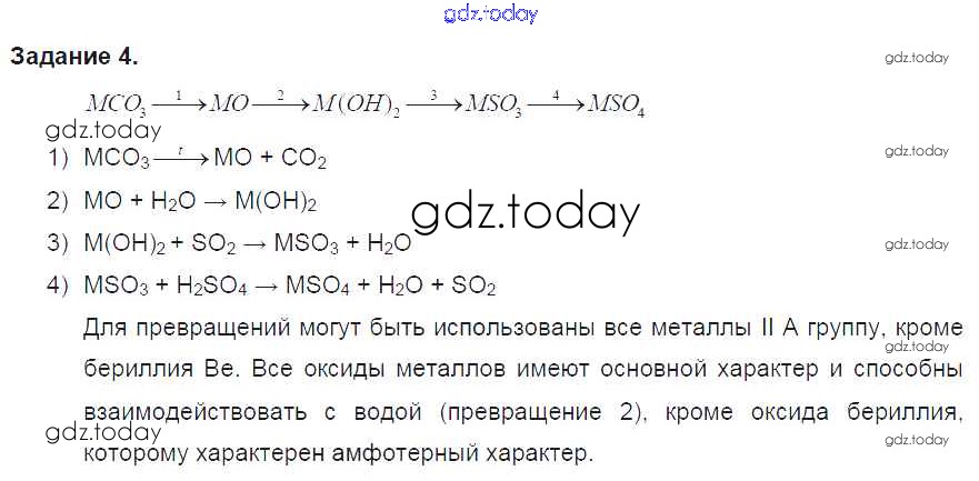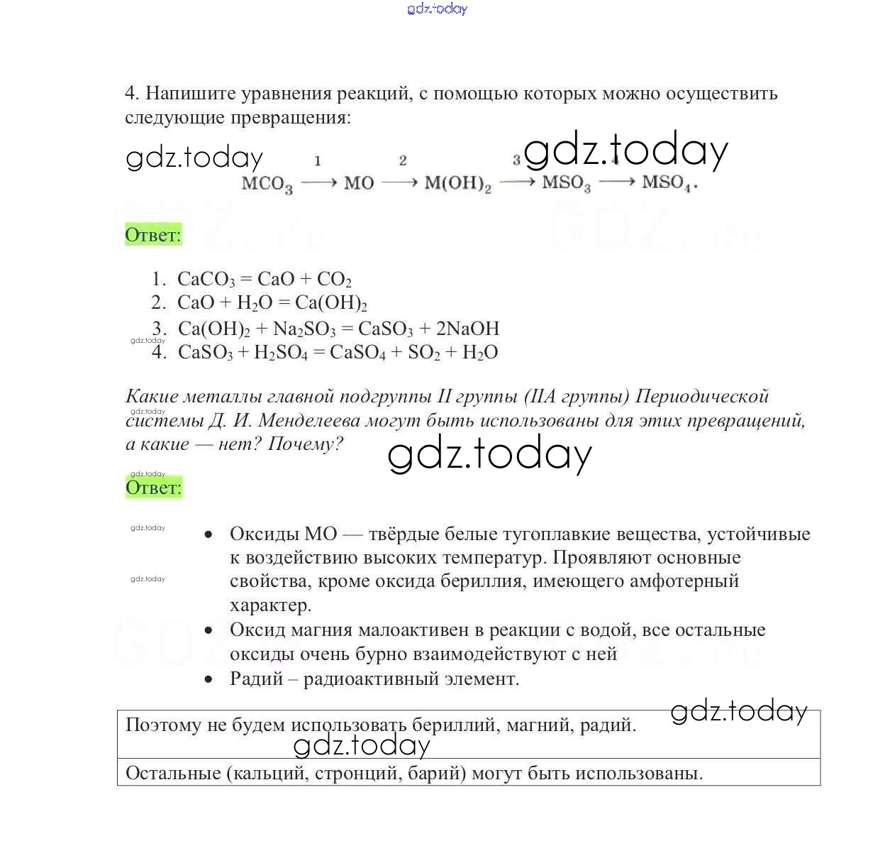 На страницах сайта gdz.today вы найдете учебный и вспомогательный материал, направленный на улучшения знаний школьной программы. ГДЗ - онлайн мир знаний Решение к §15. Бериллий, магний и щёлочноземельные металлы 4 Учебнику по Химии для 9 класса Габриелян Дрофа Вертикаль 2014