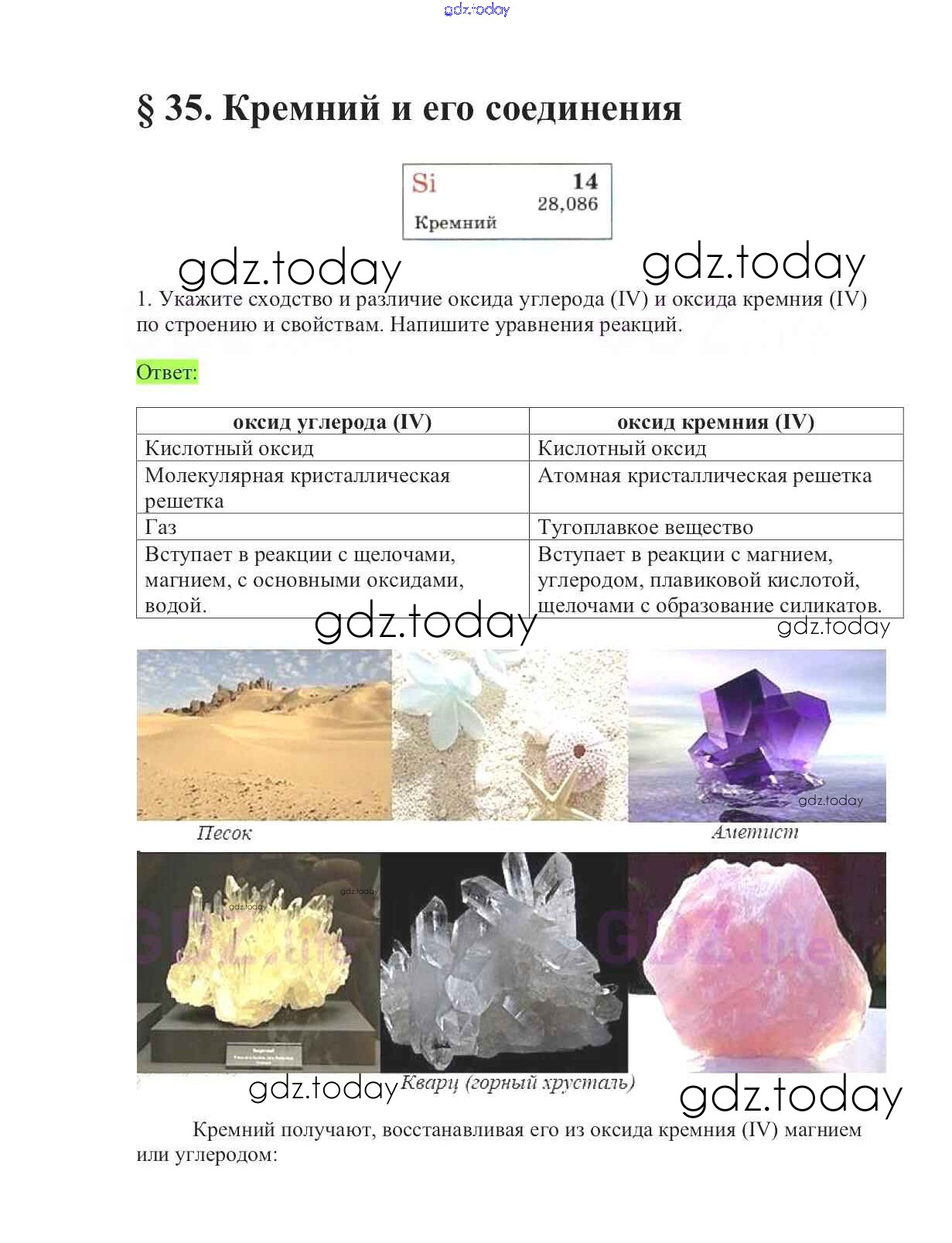 На страницах сайта gdz.today вы найдете учебный и вспомогательный материал, направленный на улучшения знаний школьной программы. ГДЗ - онлайн мир знаний Решение к §35. Кремний и его соединения 1 Учебнику по Химии для 9 класса Габриелян Дрофа Вертикаль 2014