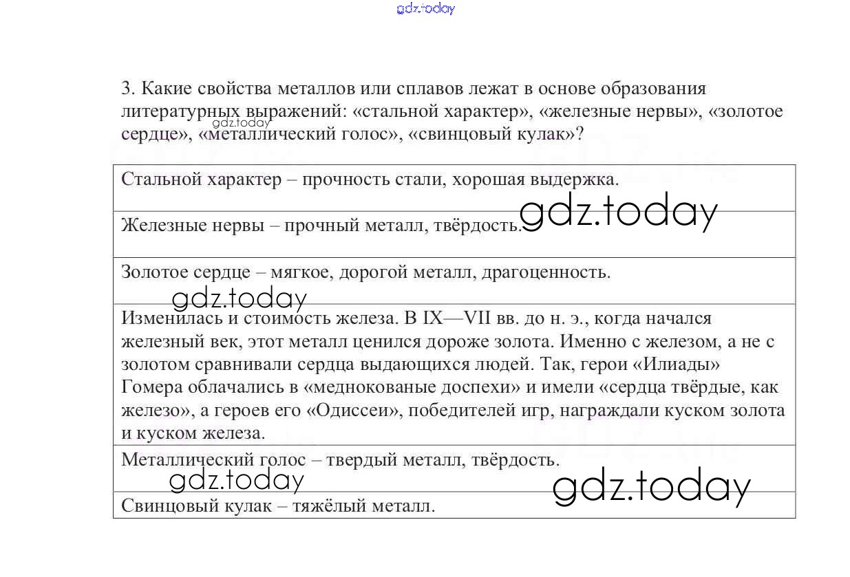 На страницах сайта gdz.today вы найдете учебный и вспомогательный материал, направленный на улучшения знаний школьной программы. ГДЗ - онлайн мир знаний Решение к §7. Век медный, бронзовый, железный 3 Учебнику по Химии для 9 класса Габриелян Дрофа Вертикаль 2014