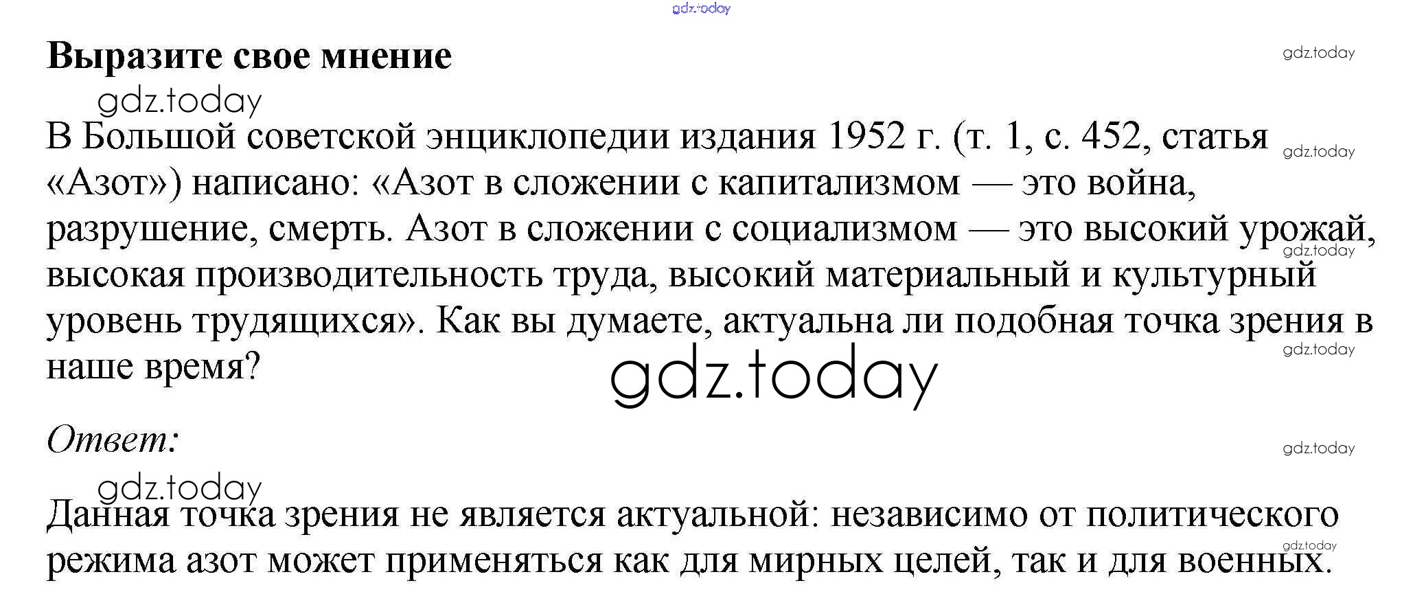 На страницах сайта gdz.today вы найдете учебный и вспомогательный материал, направленный на улучшения знаний школьной программы. ГДЗ - онлайн мир знаний Выразите своё мнение Решение к §16 1 Учебнику по Химии для 9 класса Габриелян, Остроумов Просвещение 2021