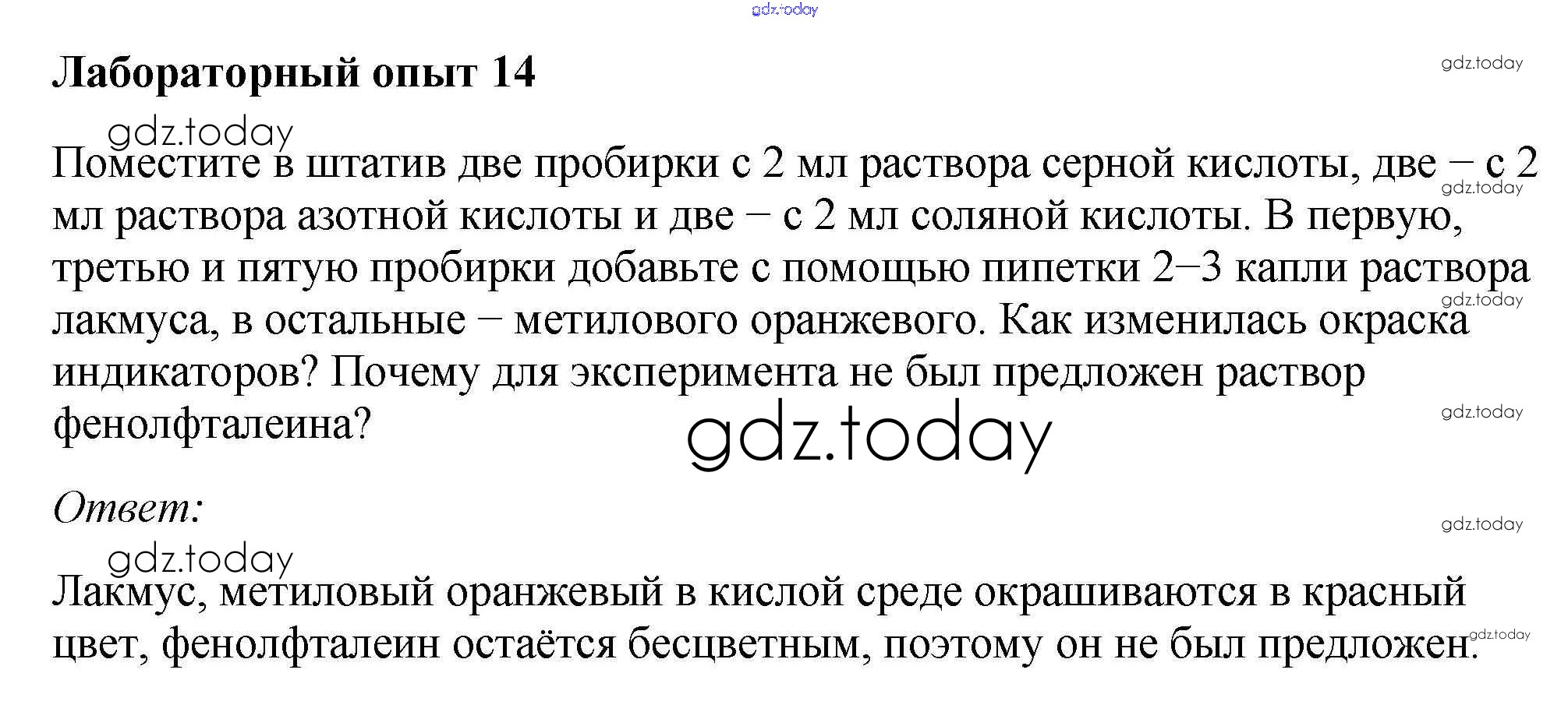 На страницах сайта gdz.today вы найдете учебный и вспомогательный материал, направленный на улучшения знаний школьной программы. ГДЗ - онлайн мир знаний Решение к лабораторным опытам 14 Учебнику по Химии для 9 класса Габриелян, Остроумов Просвещение 2021