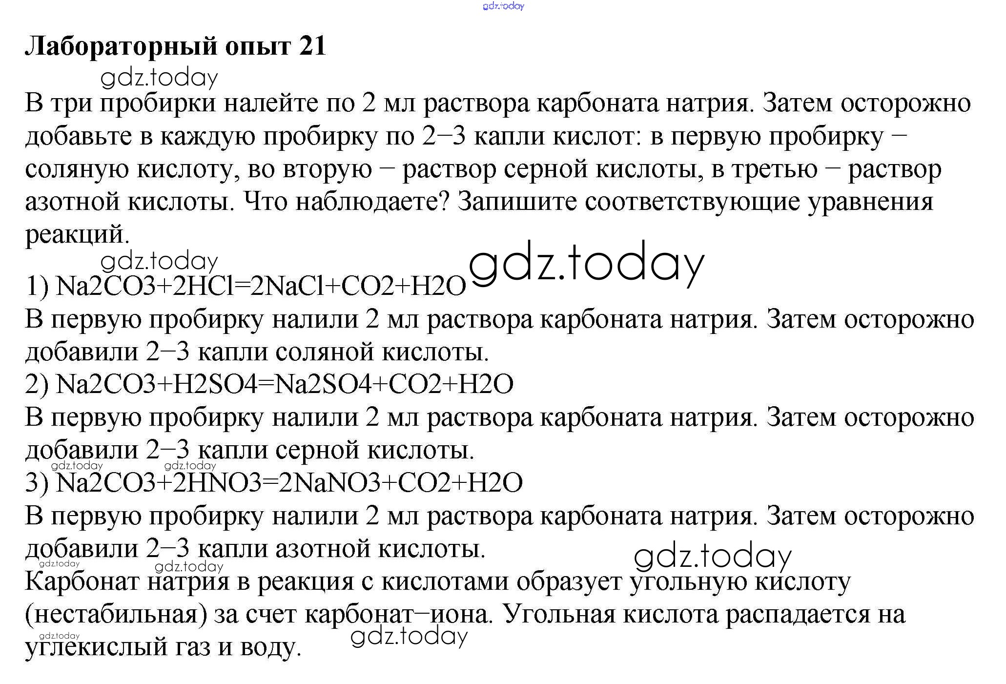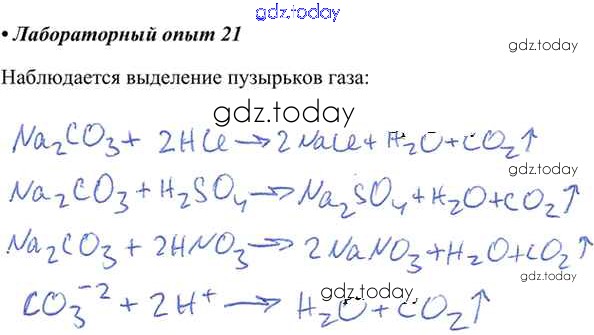 На страницах сайта gdz.today вы найдете учебный и вспомогательный материал, направленный на улучшения знаний школьной программы. ГДЗ - онлайн мир знаний Решение к лабораторным опытам 21 Учебнику по Химии для 9 класса Габриелян, Остроумов Просвещение 2021