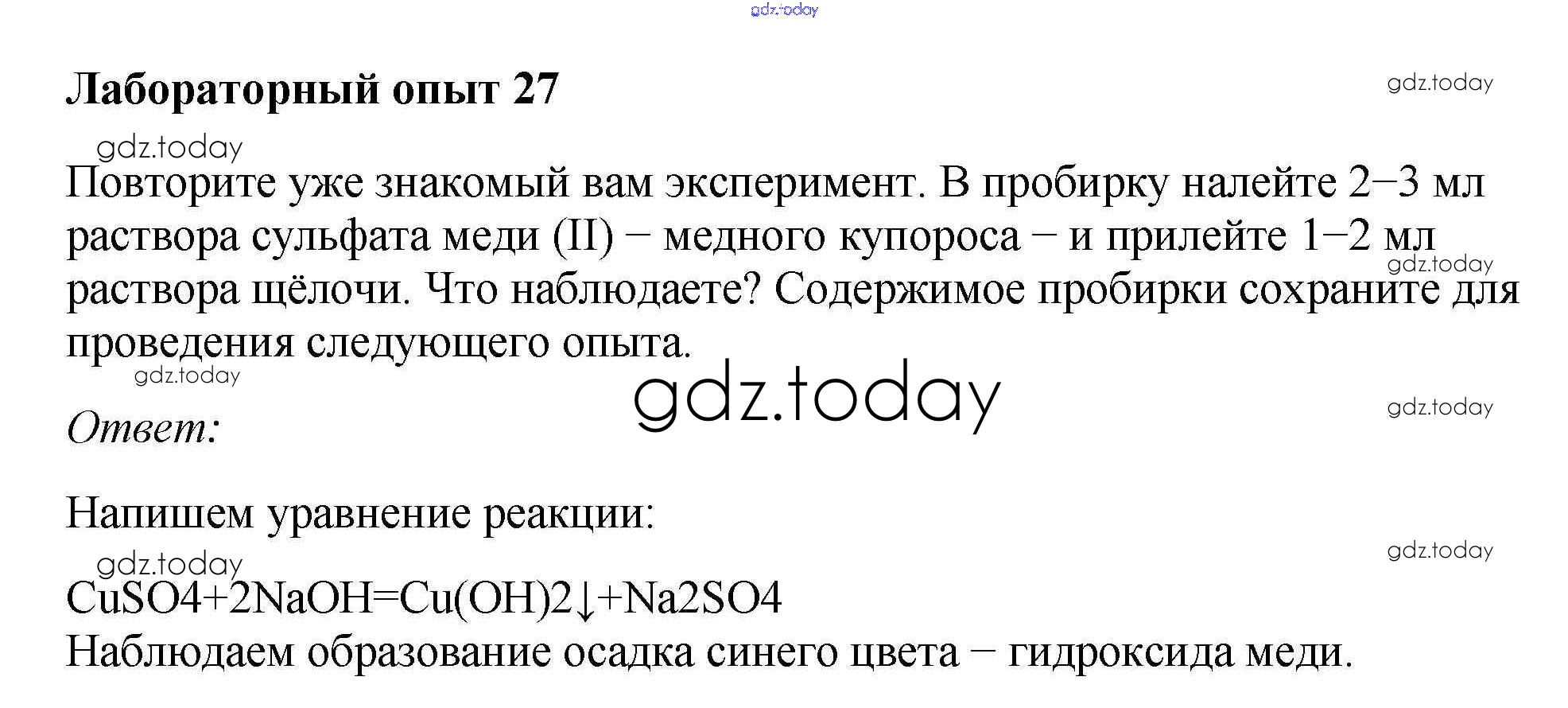 На страницах сайта gdz.today вы найдете учебный и вспомогательный материал, направленный на улучшения знаний школьной программы. ГДЗ - онлайн мир знаний Решение к лабораторным опытам 27 Учебнику по Химии для 9 класса Габриелян, Остроумов Просвещение 2021