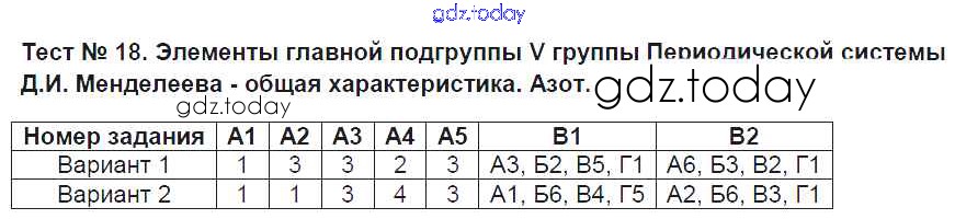 Ответы к Решение к тестам Тест №18. Элементы главной подгруппы v группы Периодической системы Д.И. Менделеева - общая характеристика. Азот Контрольно-измерительным материалам (КИМ) по Химии для 9 класса Стрельникова ВАКО 2017