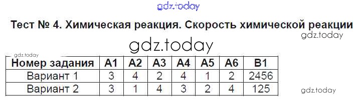 Ответы к Решение к тестам Тест №4. Химическая реакция. Скорость химической реакции Контрольно-измерительным материалам (КИМ) по Химии для 9 класса Стрельникова ВАКО 2017