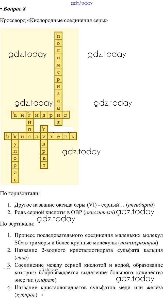 На страницах сайта gdz.today вы найдете учебный и вспомогательный материал, направленный на улучшения знаний школьной программы. ГДЗ - онлайн мир знаний Вопросы Решение к §24 8 Учебнику по Химии для 9 класса Кузнецова, Титова Вентана-граф Алгоритм успеха 2019
