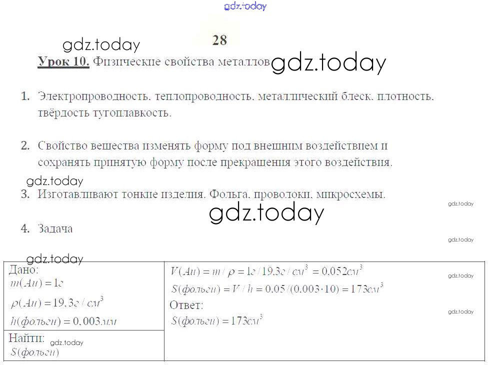 На страницах сайта gdz.today вы найдете учебный и вспомогательный материал, направленный на улучшения знаний школьной программы. ГДЗ - онлайн мир знаний Решение к уроку 10. Физические свойства металлов стр.28 Рабочей тетради по Химии для 9 класса Микитюк Дрофа УМК 2014