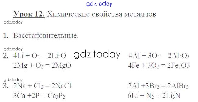 На страницах сайта gdz.today вы найдете учебный и вспомогательный материал, направленный на улучшения знаний школьной программы. ГДЗ - онлайн мир знаний Решение к уроку 12. Химические свойства металлов стр.32 Рабочей тетради по Химии для 9 класса Микитюк Дрофа УМК 2014