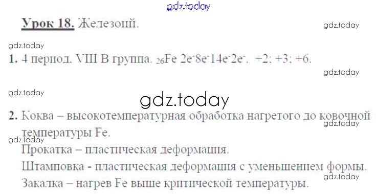 На страницах сайта gdz.today вы найдете учебный и вспомогательный материал, направленный на улучшения знаний школьной программы. ГДЗ - онлайн мир знаний Решение к уроку 18. Железо стр.47 Рабочей тетради по Химии для 9 класса Микитюк Дрофа УМК 2014