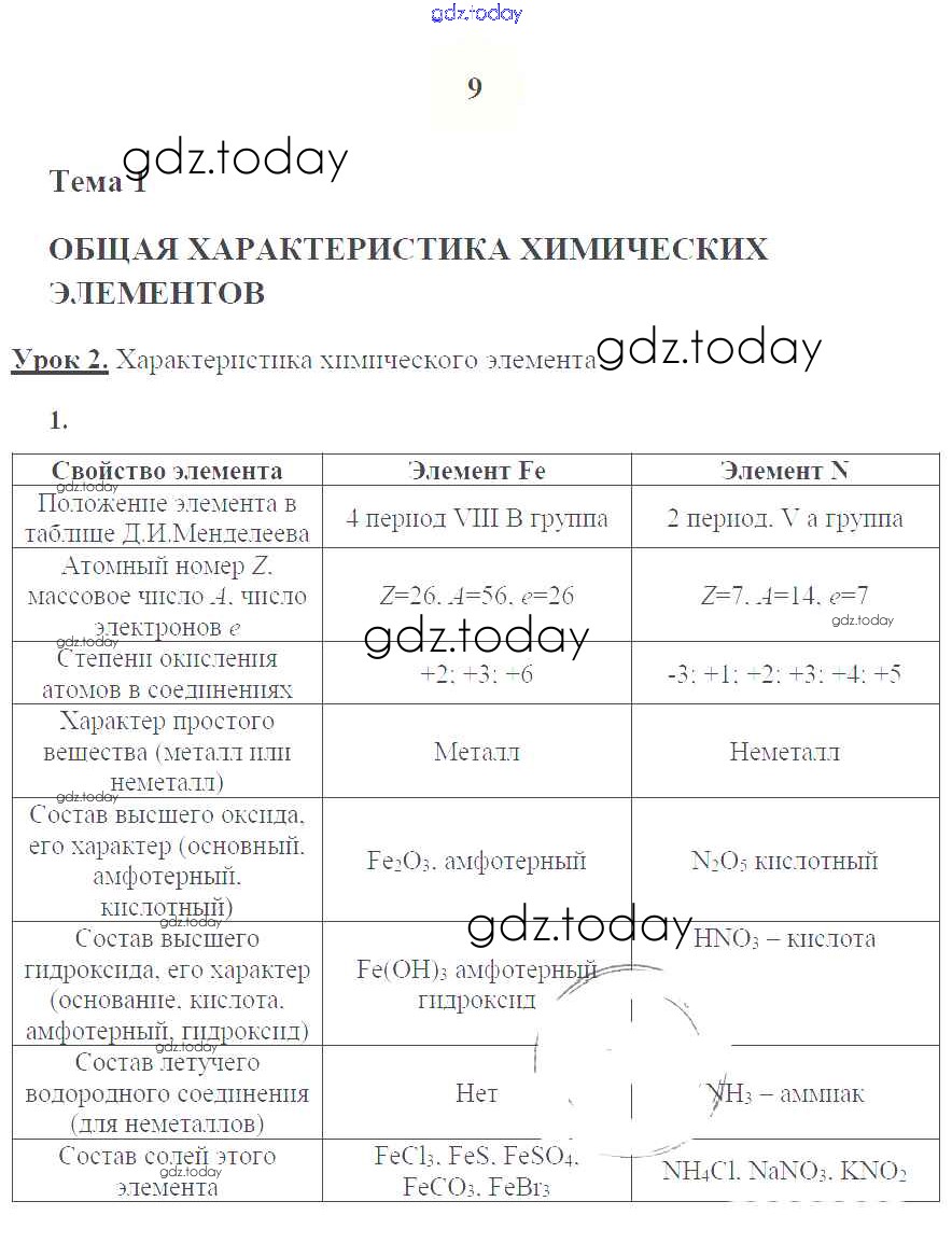 На страницах сайта gdz.today вы найдете учебный и вспомогательный материал, направленный на улучшения знаний школьной программы. ГДЗ - онлайн мир знаний Решение к уроку 2. Характеристика химического элемента стр.9 Рабочей тетради по Химии для 9 класса Микитюк Дрофа УМК 2014