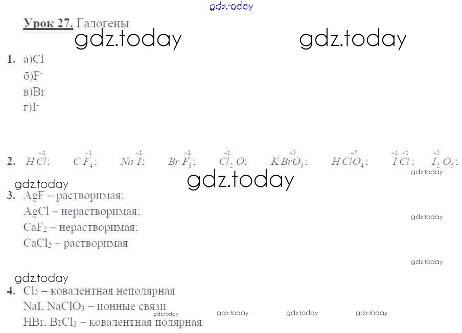 На страницах сайта gdz.today вы найдете учебный и вспомогательный материал, направленный на улучшения знаний школьной программы. ГДЗ - онлайн мир знаний Решение к уроку 27. Галогены стр.71 Рабочей тетради по Химии для 9 класса Микитюк Дрофа УМК 2014