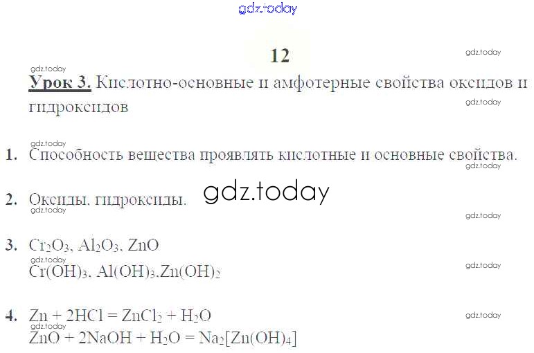 На страницах сайта gdz.today вы найдете учебный и вспомогательный материал, направленный на улучшения знаний школьной программы. ГДЗ - онлайн мир знаний Решение к уроку 3. Кислотно-основные и амфотерные свойства оксидов и гидроксидов стр.12 Рабочей тетради по Химии для 9 класса Микитюк Дрофа УМК 2014