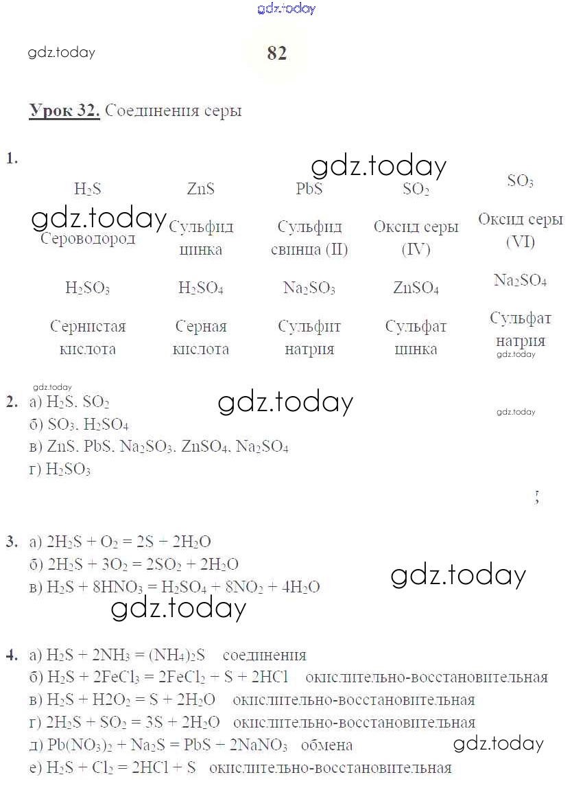 На страницах сайта gdz.today вы найдете учебный и вспомогательный материал, направленный на улучшения знаний школьной программы. ГДЗ - онлайн мир знаний Решение к уроку 32. Соединения серы стр.82 Рабочей тетради по Химии для 9 класса Микитюк Дрофа УМК 2014