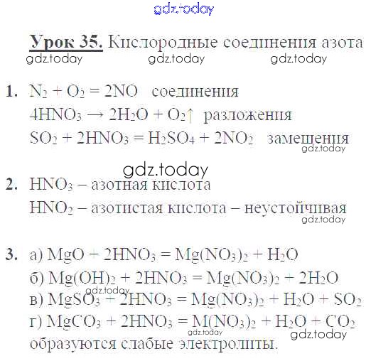 На страницах сайта gdz.today вы найдете учебный и вспомогательный материал, направленный на улучшения знаний школьной программы. ГДЗ - онлайн мир знаний Решение к уроку 35. Кислородные соединения азота стр.89 Рабочей тетради по Химии для 9 класса Микитюк Дрофа УМК 2014