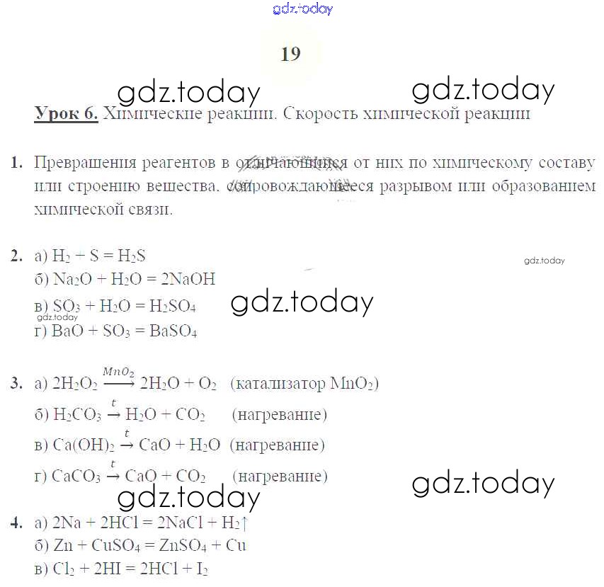 На страницах сайта gdz.today вы найдете учебный и вспомогательный материал, направленный на улучшения знаний школьной программы. ГДЗ - онлайн мир знаний Решение к уроку 6. Химические реакции. Скорость химической реакции стр.19 Рабочей тетради по Химии для 9 класса Микитюк Дрофа УМК 2014