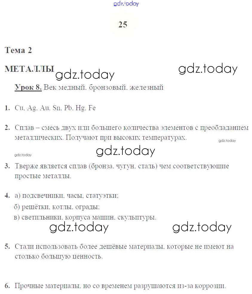 На страницах сайта gdz.today вы найдете учебный и вспомогательный материал, направленный на улучшения знаний школьной программы. ГДЗ - онлайн мир знаний Решение к уроку 8. Век медный, бронзовый, железный стр.25 Рабочей тетради по Химии для 9 класса Микитюк Дрофа УМК 2014