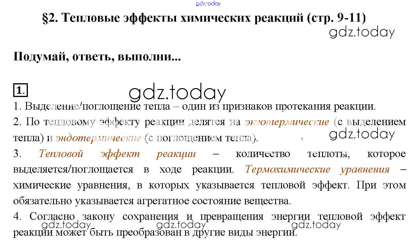 На страницах сайта gdz.today вы найдете учебный и вспомогательный материал, направленный на улучшения знаний школьной программы. ГДЗ - онлайн мир знаний § 2. Тепловые эффекты химических реакций Решение к новому изданию 1 Учебнику по Химии для 9 класса Рудзитис, Фельдман Просвещение УМК 2016