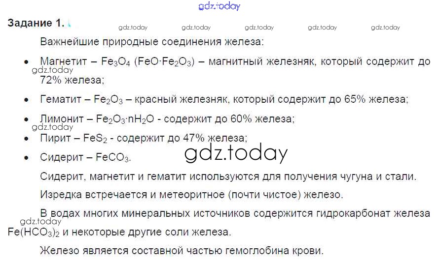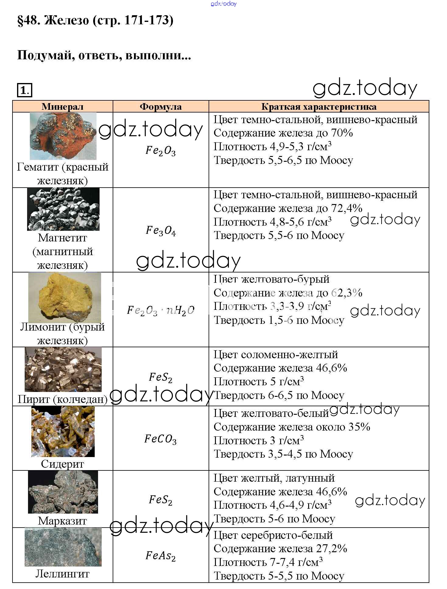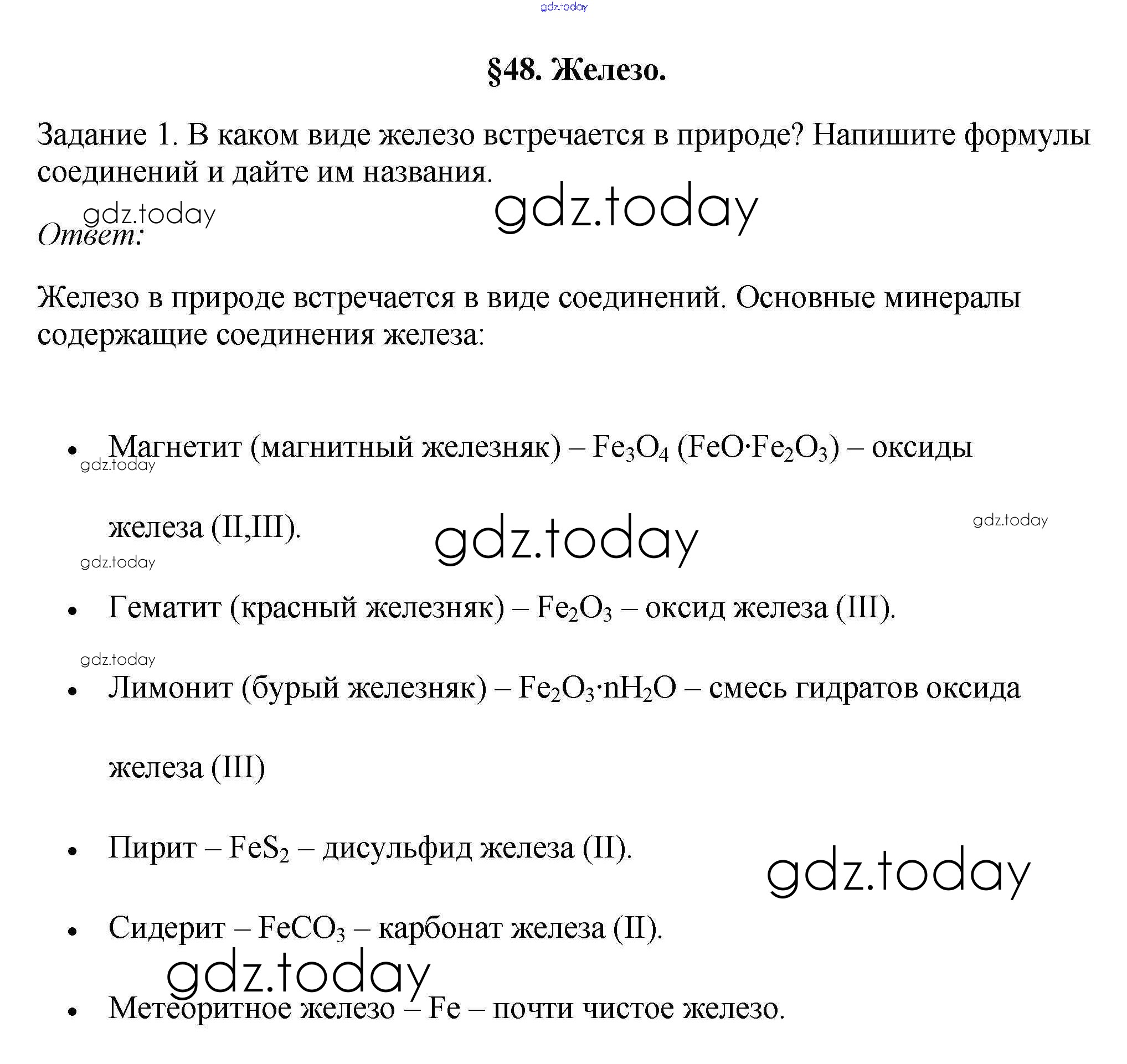 На страницах сайта gdz.today вы найдете учебный и вспомогательный материал, направленный на улучшения знаний школьной программы. ГДЗ - онлайн мир знаний § 48. Железо Решение к новому изданию 1 Учебнику по Химии для 9 класса Рудзитис, Фельдман Просвещение УМК 2016