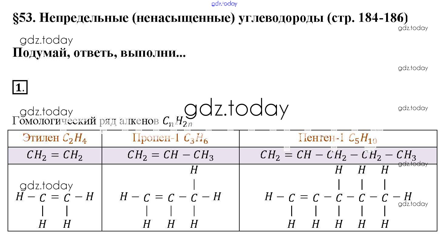 На страницах сайта gdz.today вы найдете учебный и вспомогательный материал, направленный на улучшения знаний школьной программы. ГДЗ - онлайн мир знаний § 53. Непредельные углеводороды Решение к новому изданию 1 Учебнику по Химии для 9 класса Рудзитис, Фельдман Просвещение УМК 2016