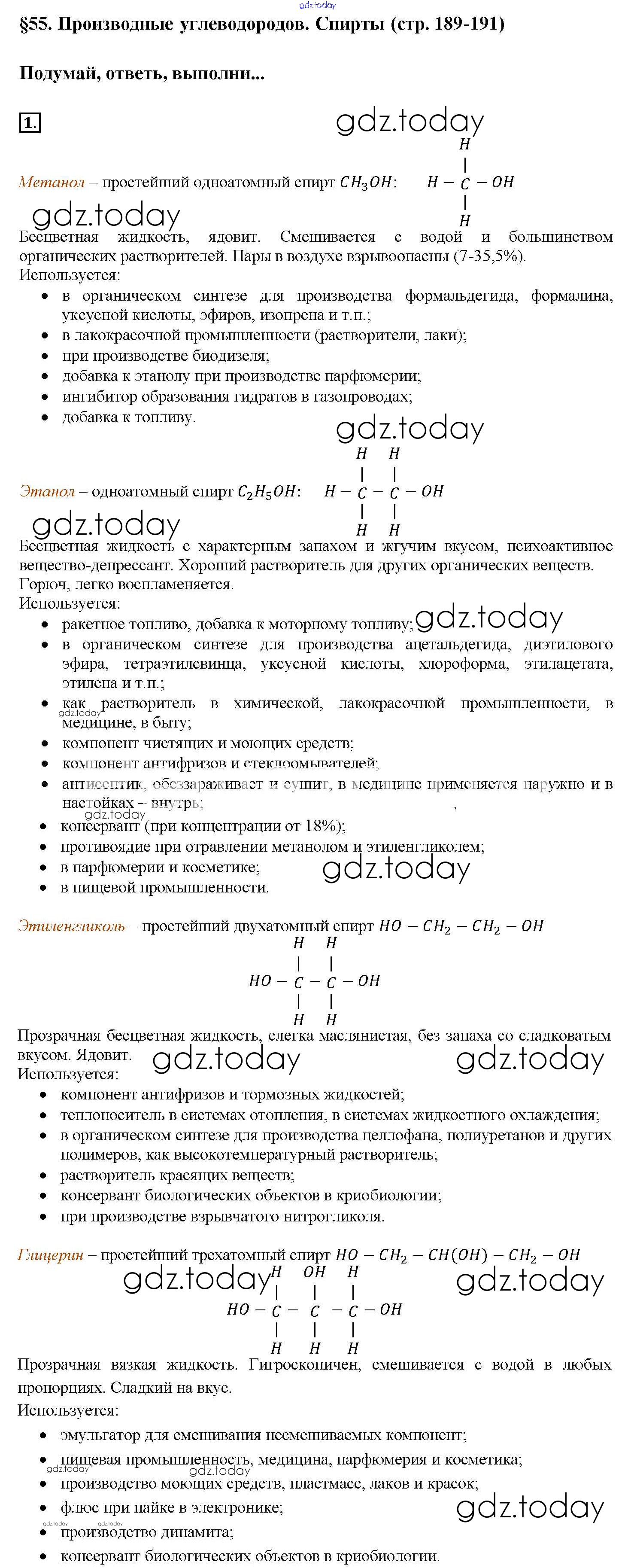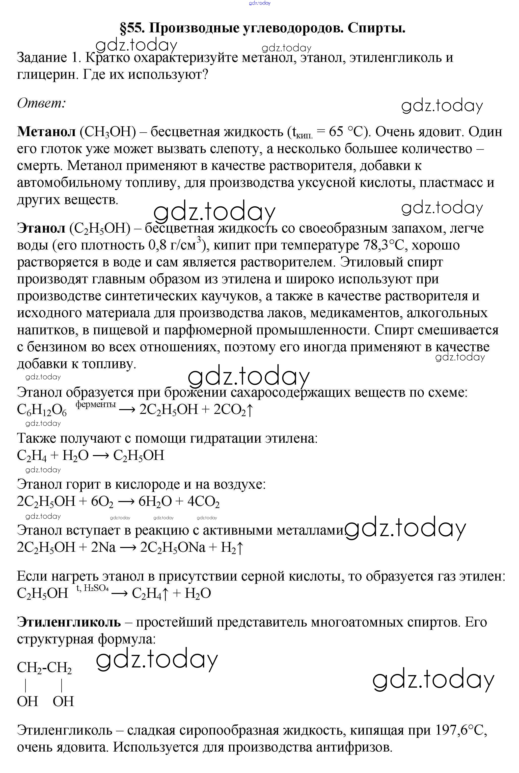 Ответы к § 55. Производные углеводородов. Спирты Решение к новому изданию 1 Учебнику по Химии для 9 класса Рудзитис, Фельдман Просвещение УМК 2016