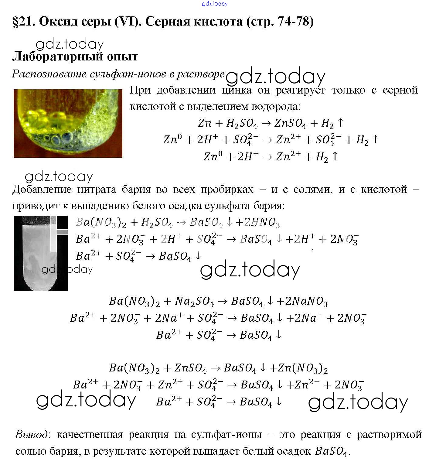 На страницах сайта gdz.today вы найдете учебный и вспомогательный материал, направленный на улучшения знаний школьной программы. ГДЗ - онлайн мир знаний § 21. Оксид серы (VI). Серная кислота Решение к новому изданию Лабораторный опыт Учебнику по Химии для 9 класса Рудзитис, Фельдман Просвещение УМК 2016