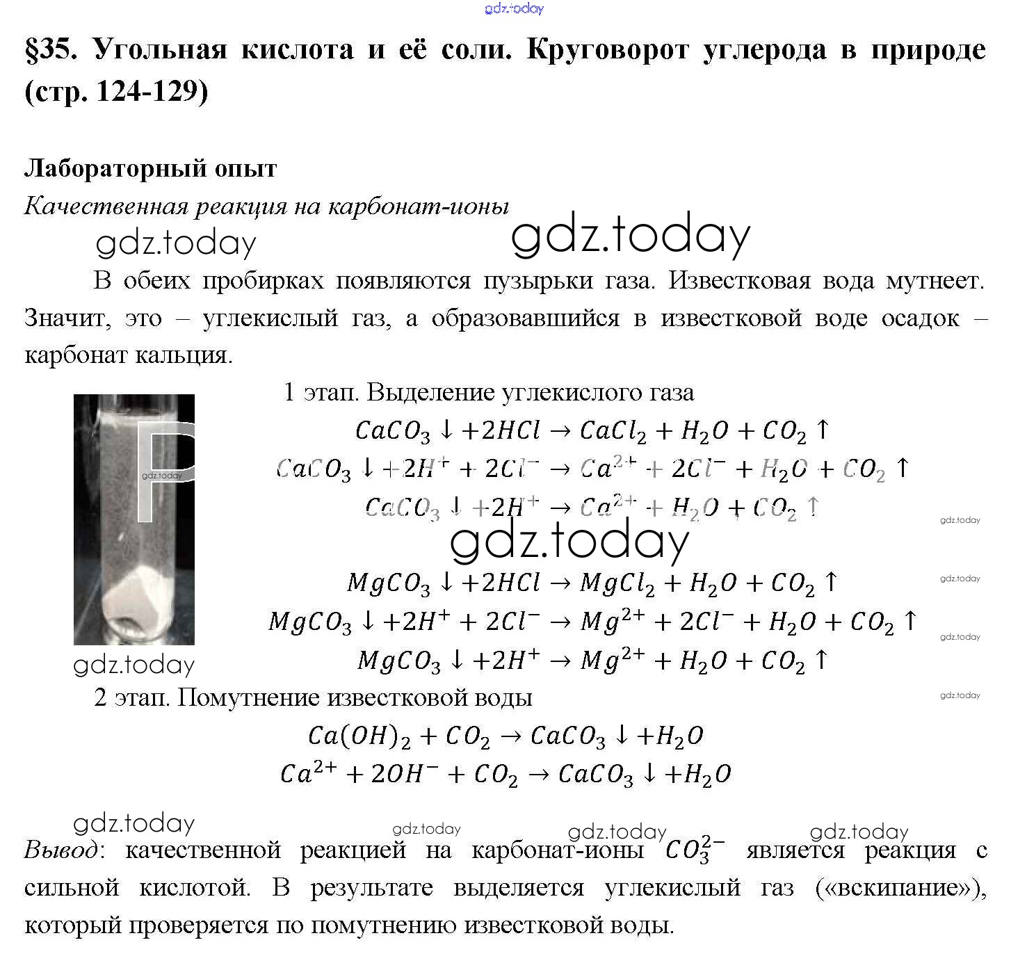 Ответы к § 35. Угольная кислота и ее соли Решение к новому изданию Лабораторный опыт Учебнику по Химии для 9 класса Рудзитис, Фельдман Просвещение УМК 2016