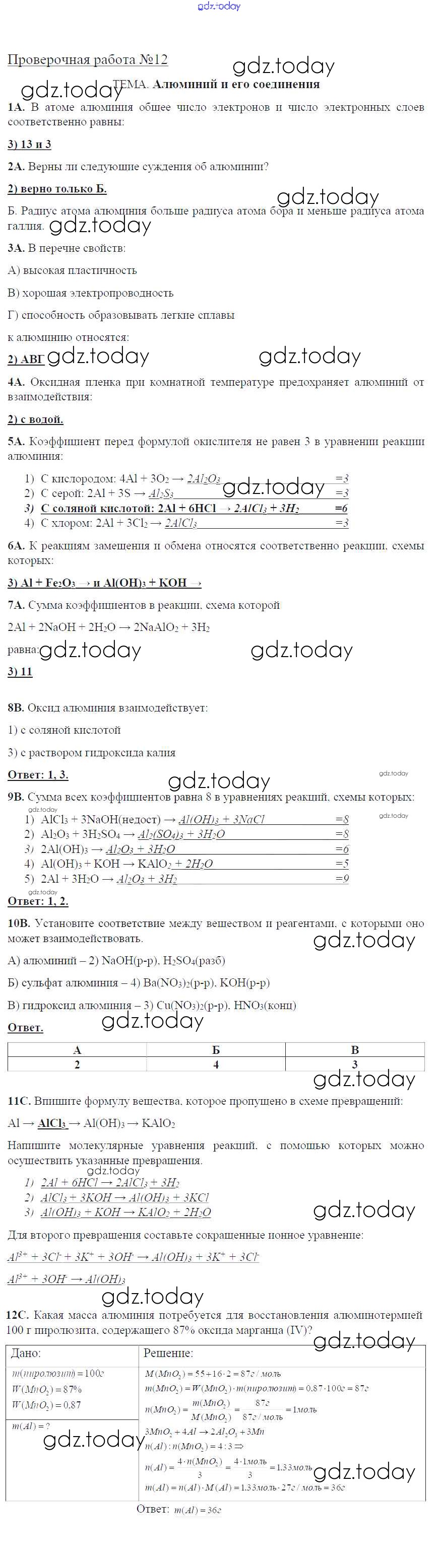 На страницах сайта gdz.today вы найдете учебный и вспомогательный материал, направленный на улучшения знаний школьной программы. ГДЗ - онлайн мир знаний Решение к проверочные работам ПР-12. Алюминий и его соединения Тетради для оценки качества знаний по Химии для 9 класса Габриелян, Крупцова Дрофа Вертикаль 2017