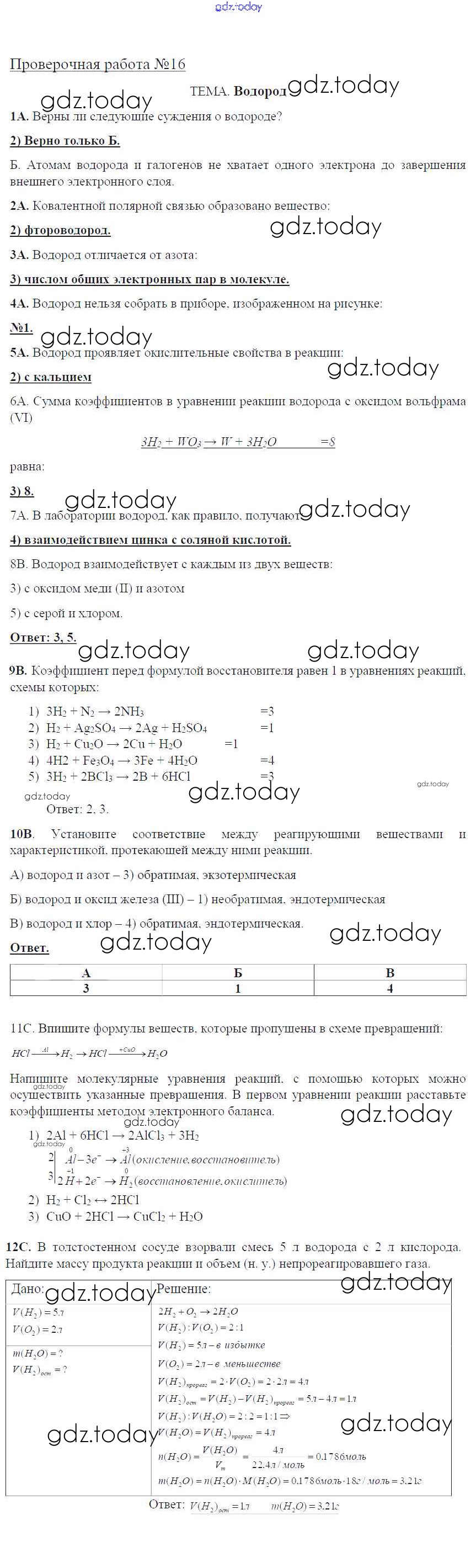 Ответы к Решение к проверочные работам ПР-16. Водород Тетради для оценки качества знаний по Химии для 9 класса Габриелян, Крупцова Дрофа Вертикаль 2017