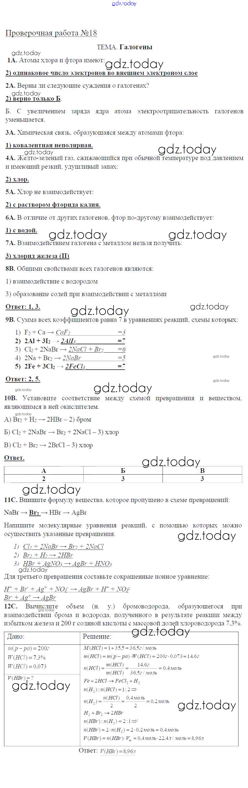 На страницах сайта gdz.today вы найдете учебный и вспомогательный материал, направленный на улучшения знаний школьной программы. ГДЗ - онлайн мир знаний Решение к проверочные работам ПР-18. Галогены Тетради для оценки качества знаний по Химии для 9 класса Габриелян, Крупцова Дрофа Вертикаль 2017