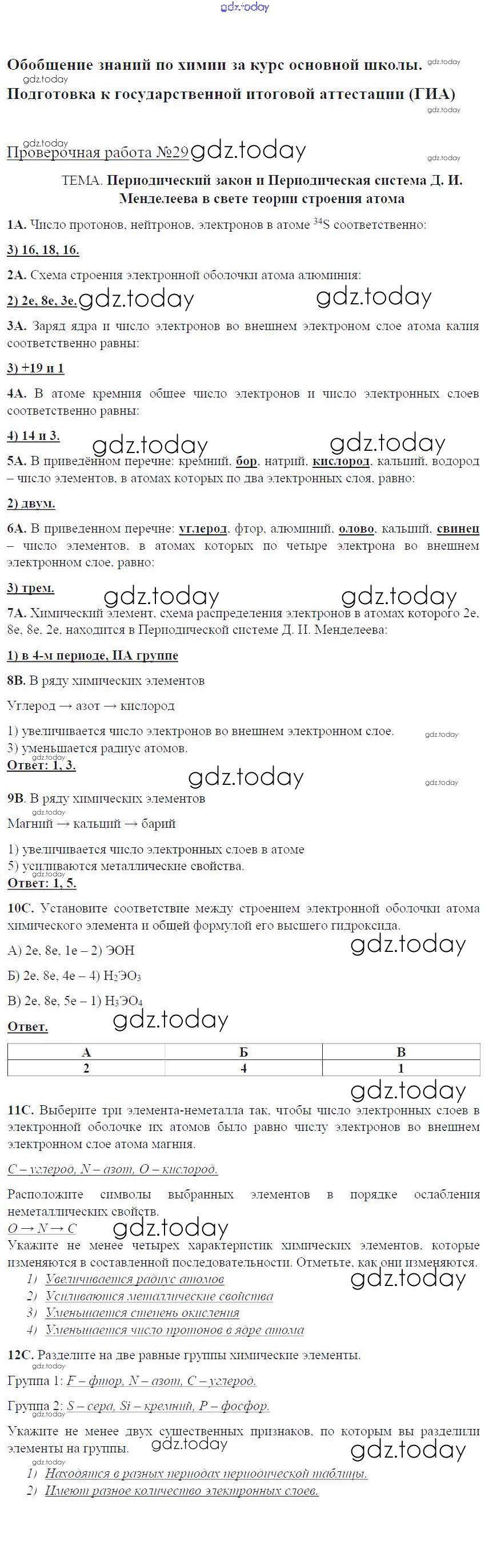 Ответы к Решение к проверочные работам ПР-29. Периодический закон и система Менделеева в свете теории строения атома Тетради для оценки качества знаний по Химии для 9 класса Габриелян, Крупцова Дрофа Вертикаль 2017